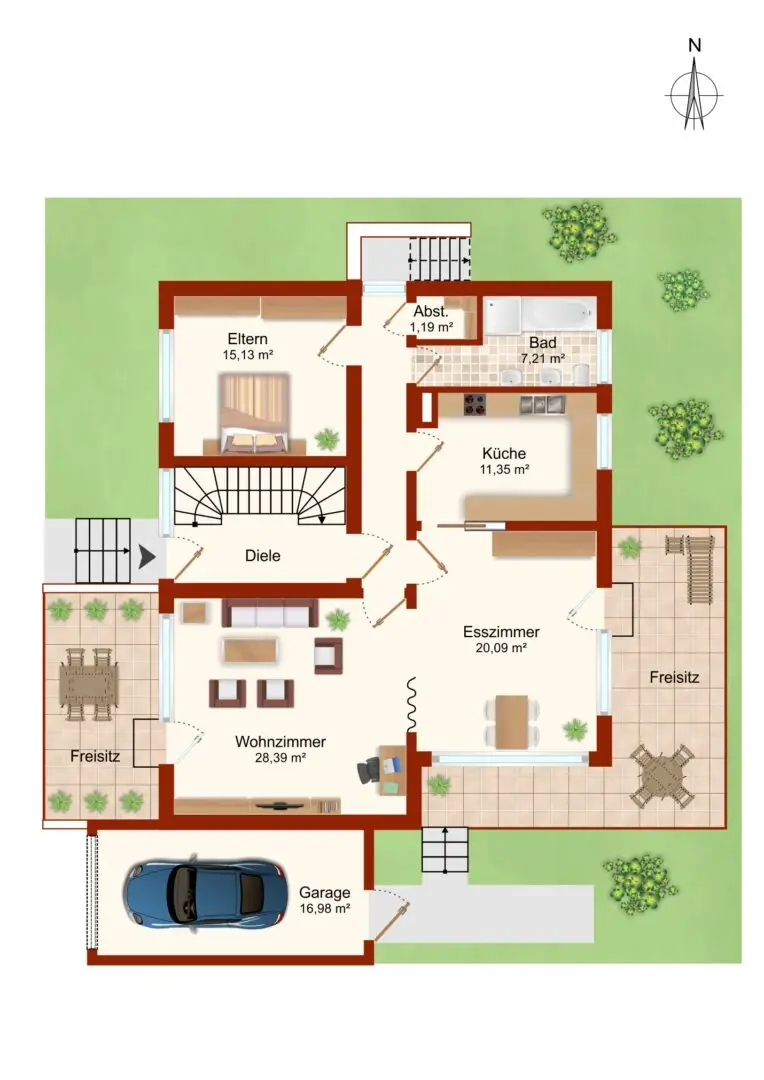Ein echtes Highlight ist das großzügige Grundstück mit ca. 764 m²: Der sehr große Garten bietet viele schöne Ecken – ob sonnige Plätze zum Entspannen, Bereiche zum Spielen, Gärtnern oder für gesellige Stunden im Freien. Durch die grüne Einbettung entsteht ein angenehm ruhiges, naturnahes Wohngefühl.